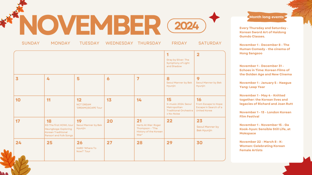 After an incredible month of Korean events in October, November always promised to be a less busy month. However, with the continuation of seasonal exhibitions and the introduction of major events, November promises to be an unmissable month for k-enthusiasts.